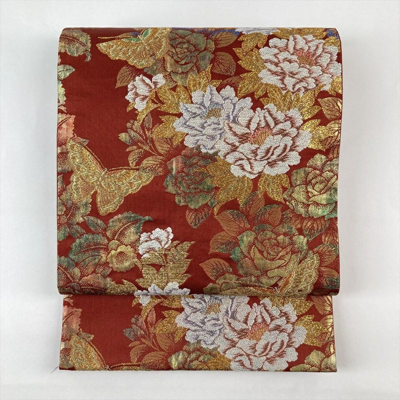 (中古)袋帯 赤色 フォーマル 六通 織り 引き箔 色糸 牡丹 蝶 薔薇 カトレア