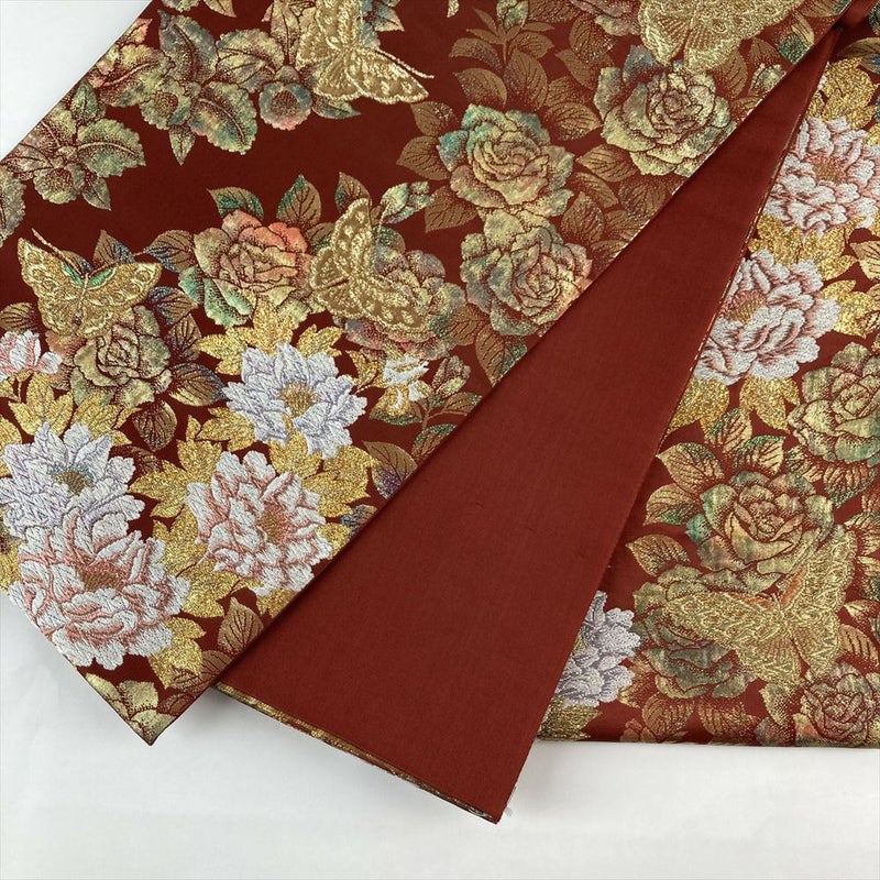 【色柄】赤色 フォーマル 牡丹 蝶 薔薇 カトレア 織り 引き箔 色糸 六通