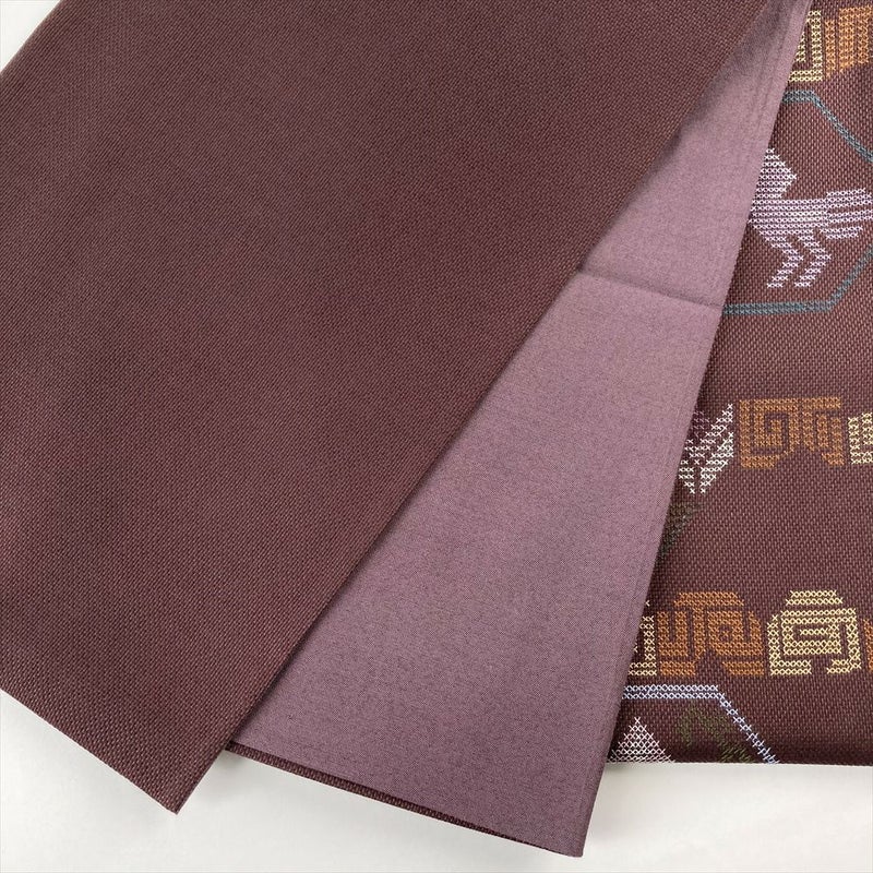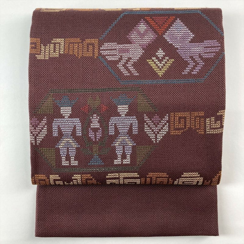 (中古)袋帯 焦げ茶色 カジュアル 六通 織り クロスステッチ 動物 植物 オリエンタル