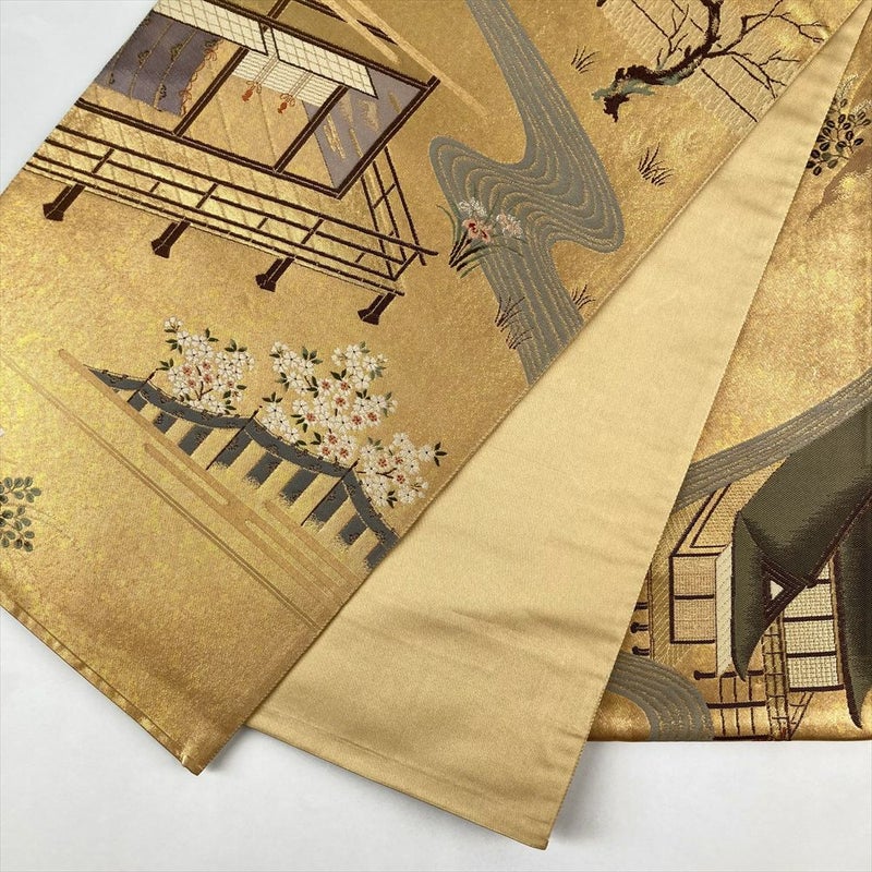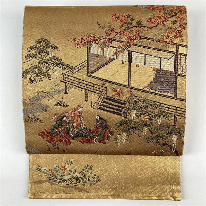 (中古)袋帯 金色 フォーマル 六通 織り引き箔 平安絵巻 四季花 庭園 姫