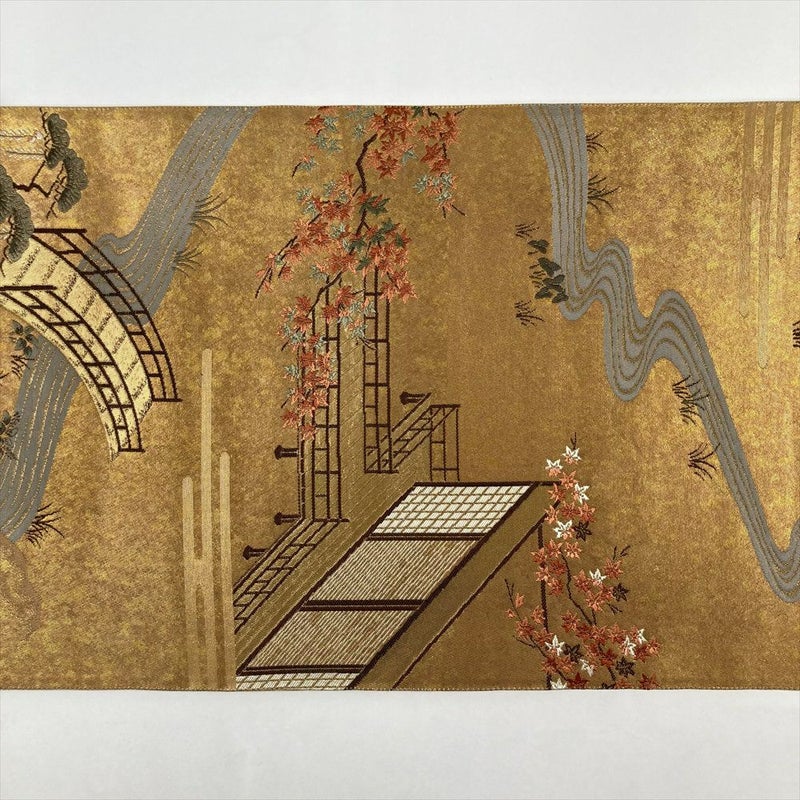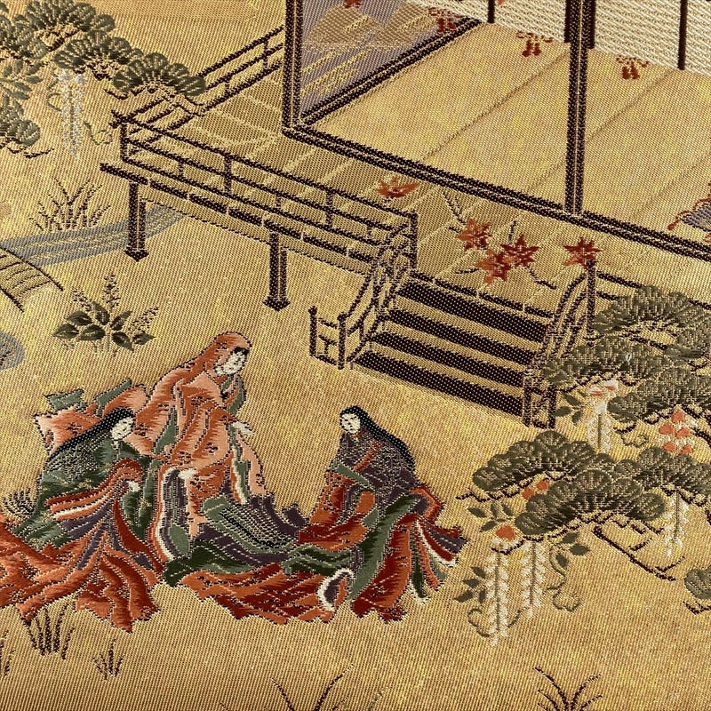 平安時代の姫君が十二単をまとい、清らかな水辺を散策する姿が目に浮かぶような、雅な庭園風景を描いた袋帯です。