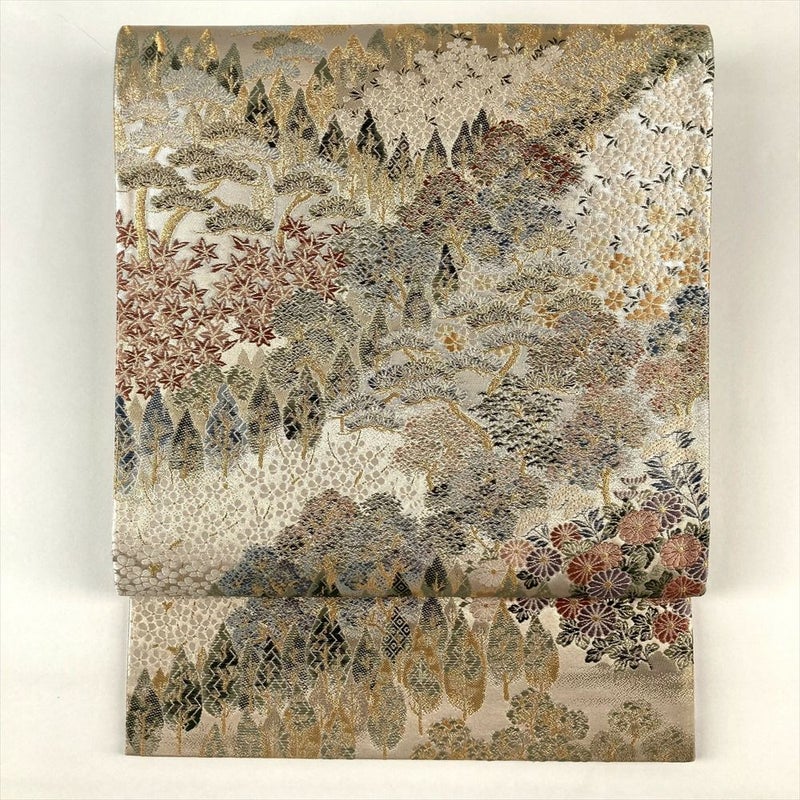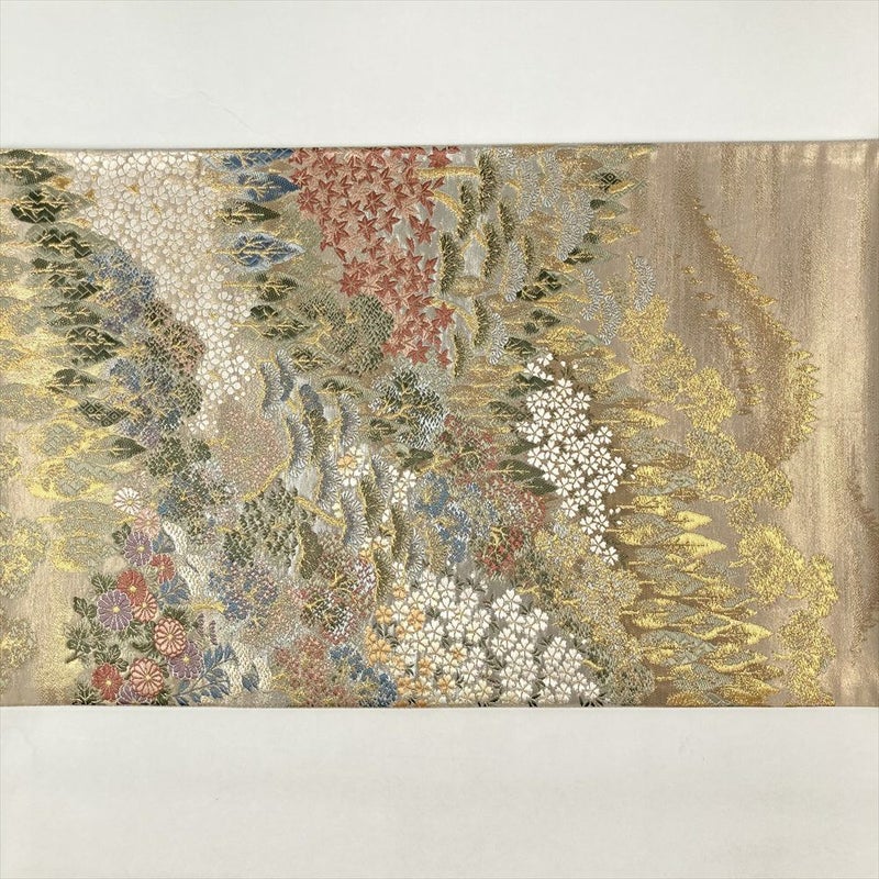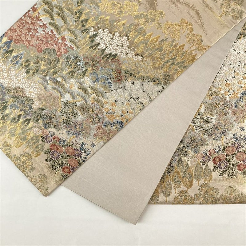 まるで絵画のような美しさ。金色とアイボリーの地に、四季折々の花々が咲き乱れる袋帯。