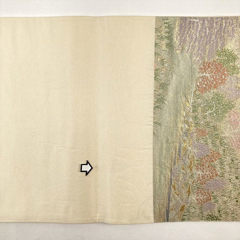 湖畔と樹木をモチーフにした、繊細な引き箔が、まるで絵画のように穏やかな情景を描きます。しっとりとした絹の肌触りが、心に安らぎをもたらし、特別な日の装いを華やかに彩ります。