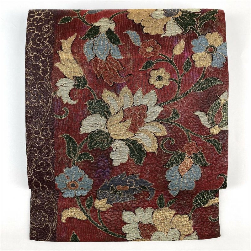 赤い地に立体的に織り込まれた唐花が美しい、西陣織の名門・渡文の袋帯です。