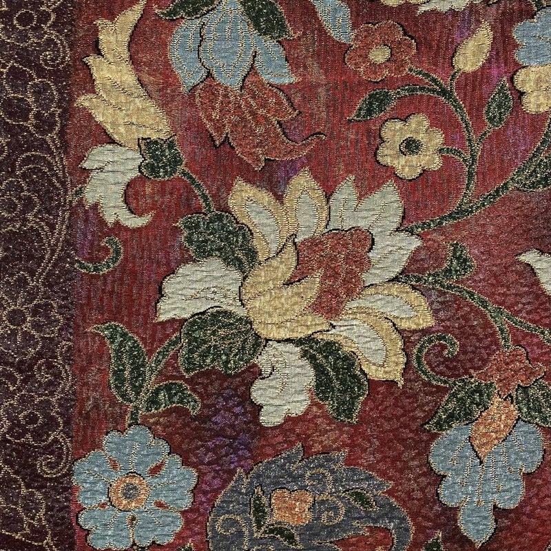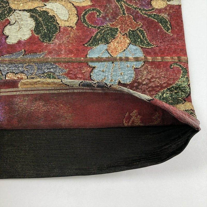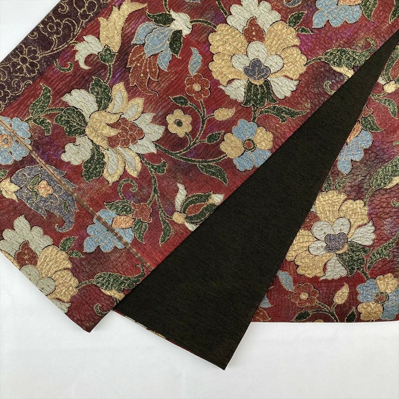 深みのある赤色と、ふっくらと浮かび上がる唐花の立体感が、オリエンタルな雰囲気を醸し出します。