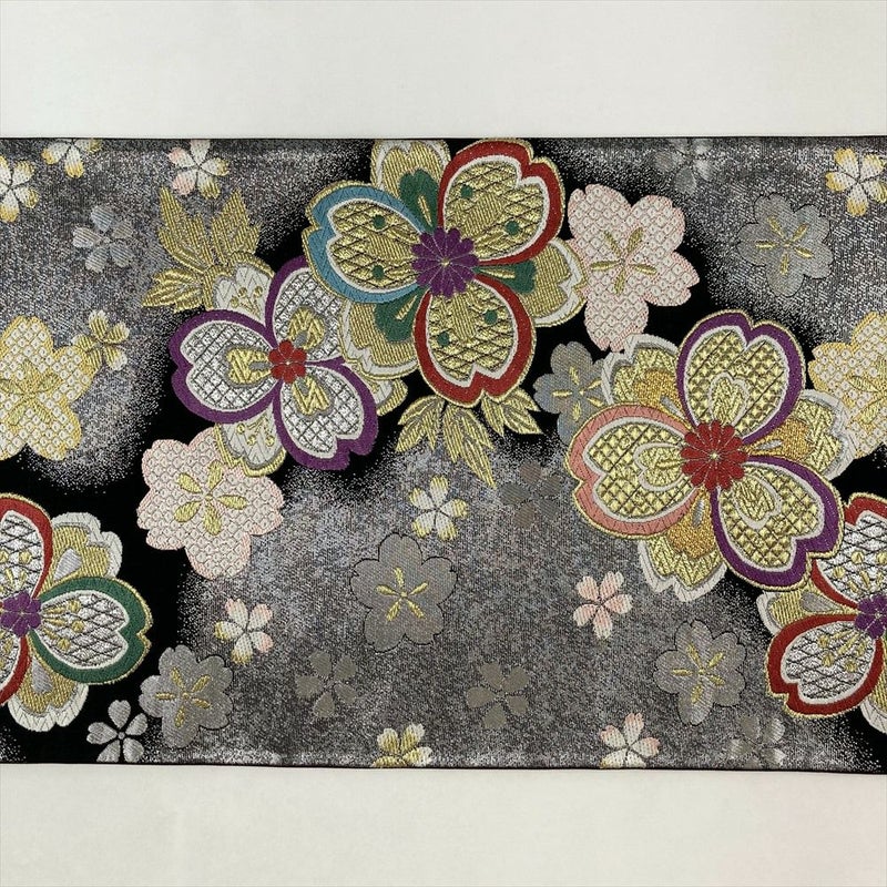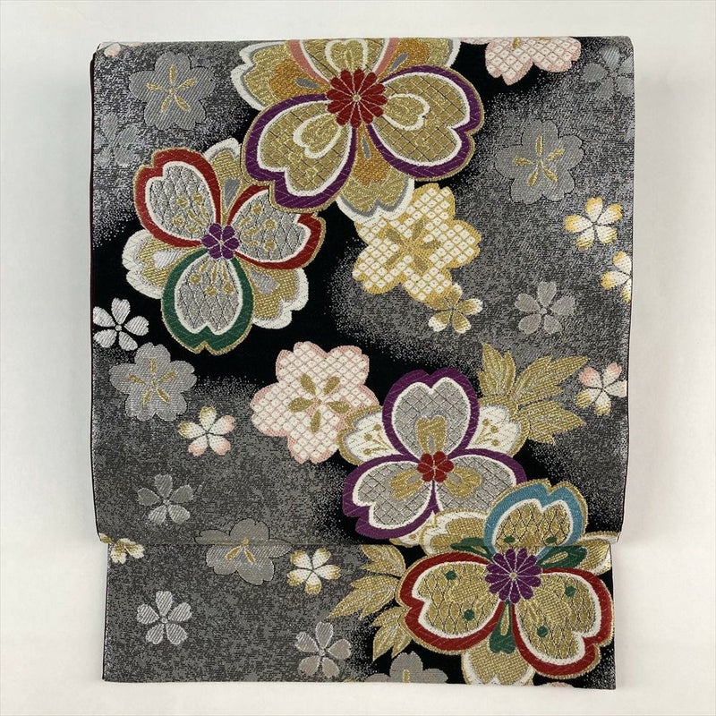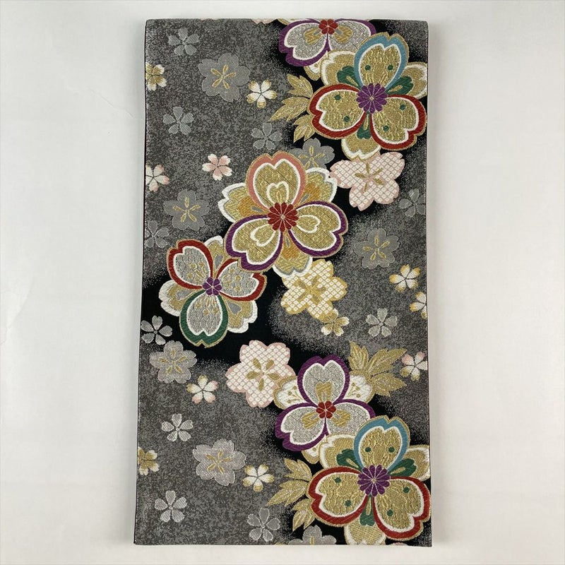 (中古)振袖用袋帯 黒 銀色 フォーマル 六通 引き箔 金糸 色糸 桜尽くし 絹