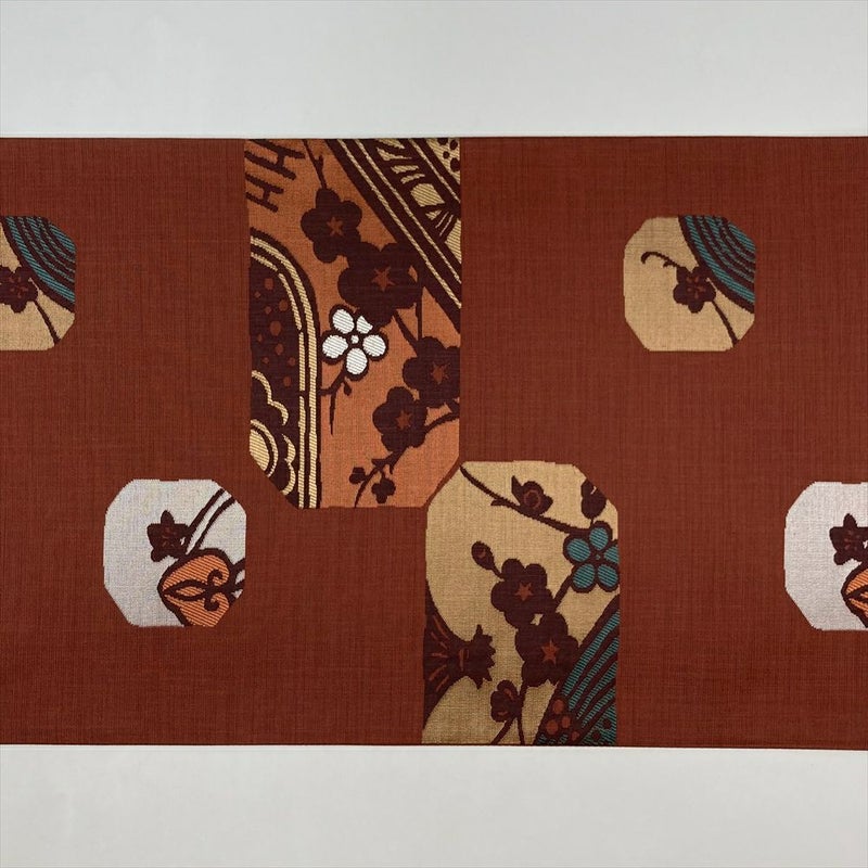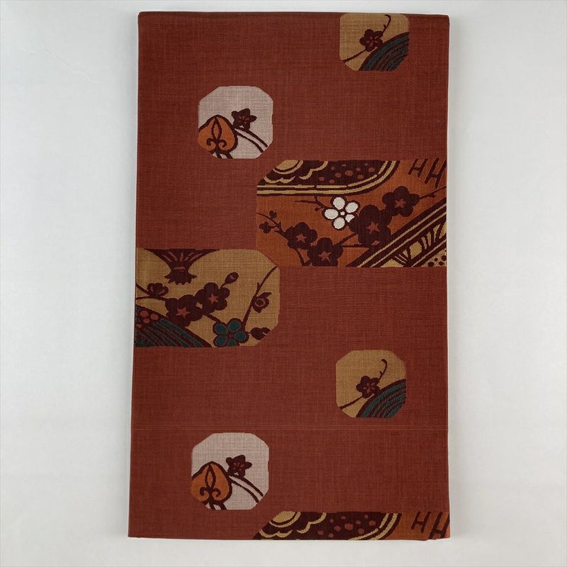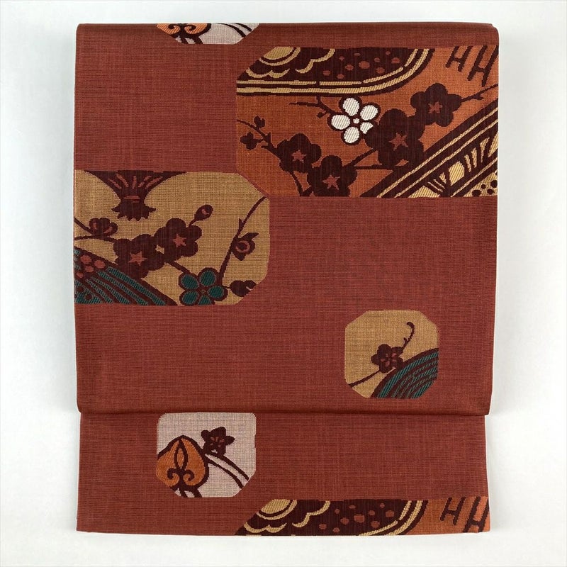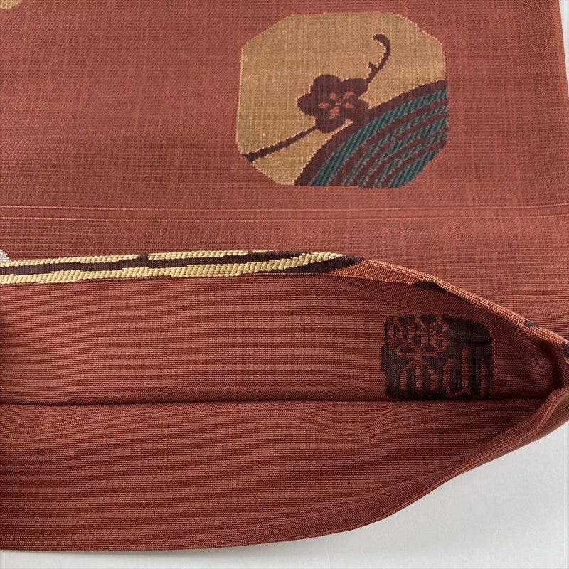 (中古)袋帯 赤茶色 カジュアル 六通 織り 梅 葵 絹