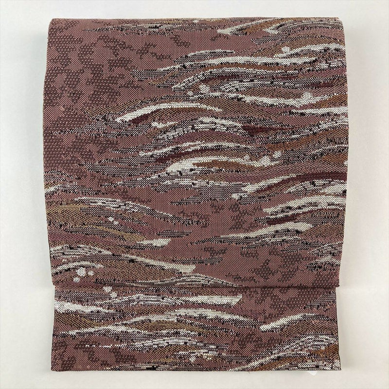 (中古)袋帯 くすみピンク 紫 紅梅色 カジュアル 六通 織り 太箔 霞 流水