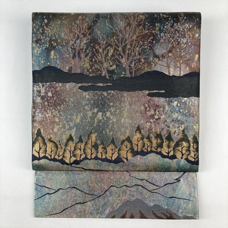 深みのある灰色と緑色の地に、引き箔で描き出された湖畔と樹木の風景が、まるで一幅の絵画のよう。