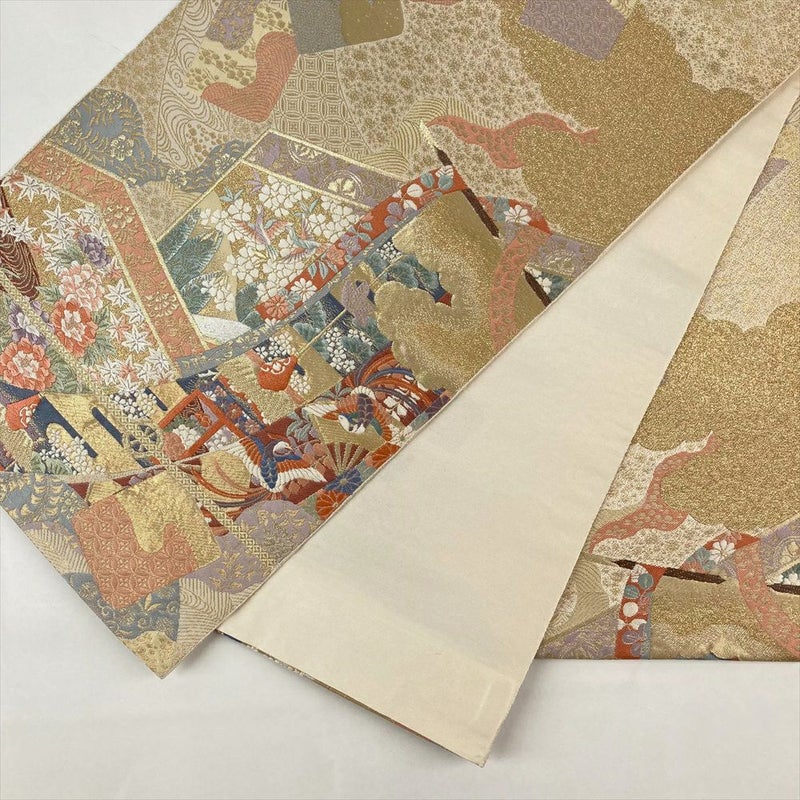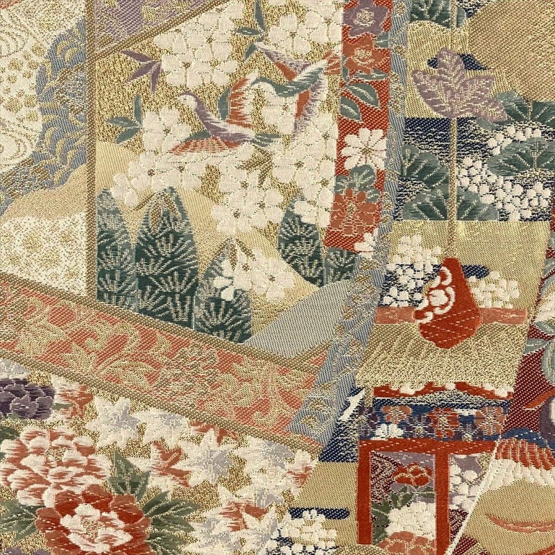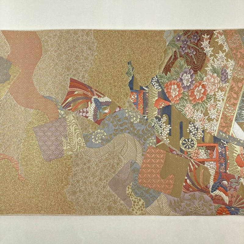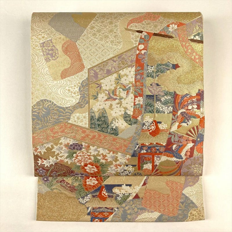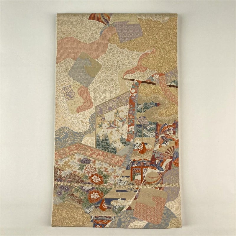 几帳、屏風、色紙といった、日本の伝統的な美意識が宿る文様を、贅沢に織り上げた袋帯です。