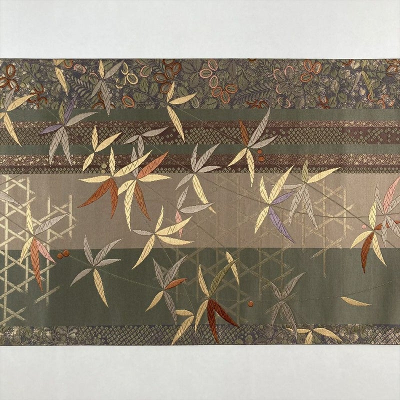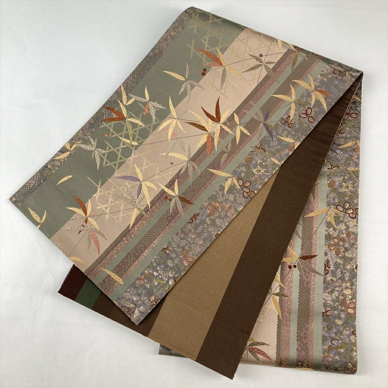 (中古)袋帯 緑 柳茶色 セミフォーマル 六通 引き箔 色糸 南天 萩 籠目 絹