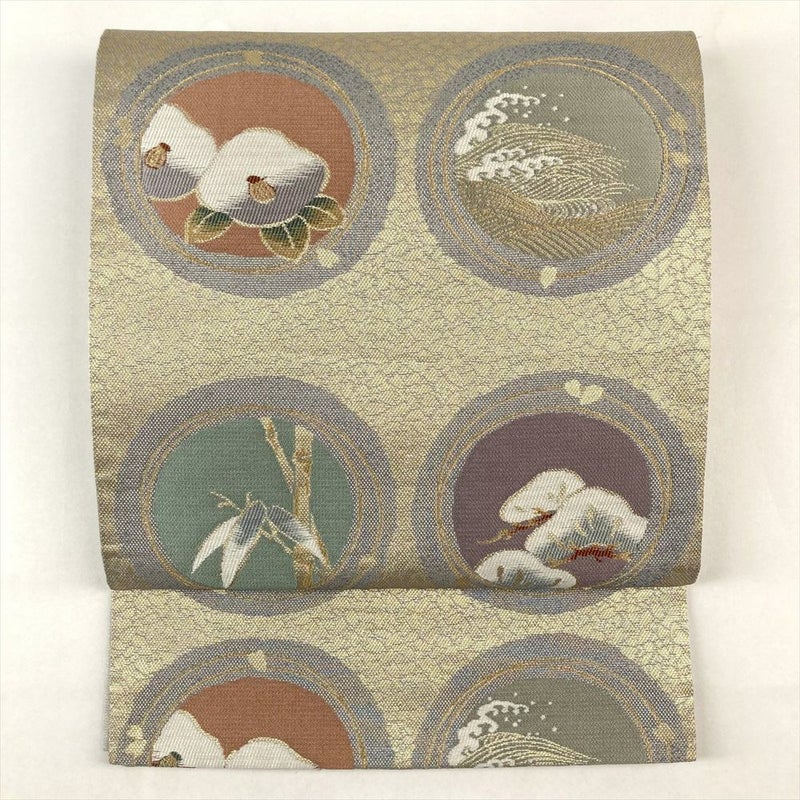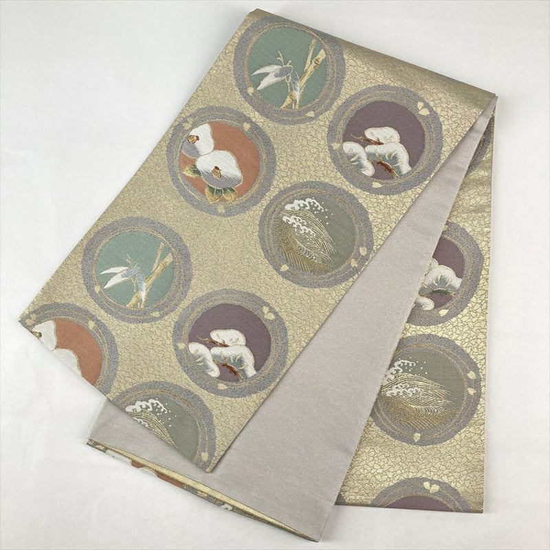 (中古)袋帯 金色 セミフォーマル 六通 引き箔 色糸 琳派 四季花 絹