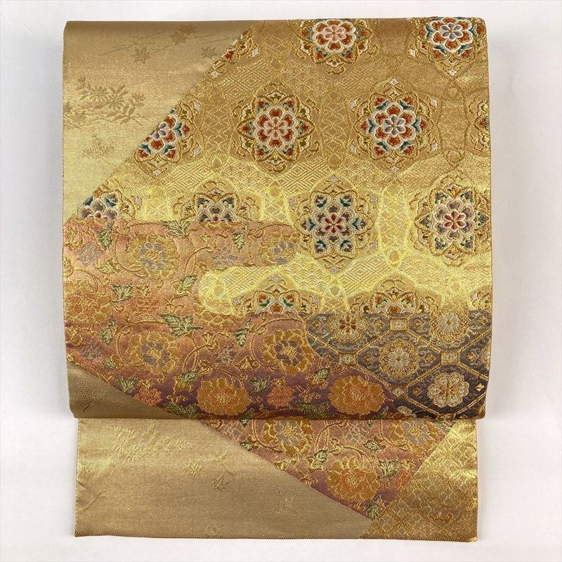 (中古)袋帯 金色 フォーマル 六通 引き箔 金糸 華文 牡丹唐草 蜀江文 絹