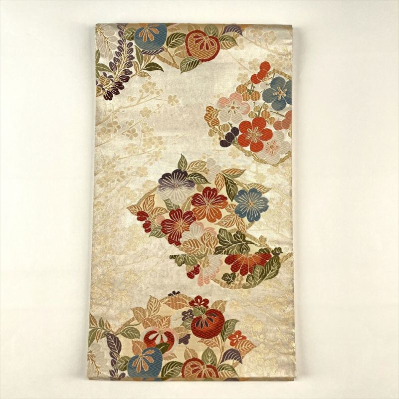 白金地に咲き誇る四季の花々。それぞれの季節の美しさを表現しています。背景に配された梅の柄は、日本の伝統美を象徴し、奥ゆかしい雰囲気を醸し出します。