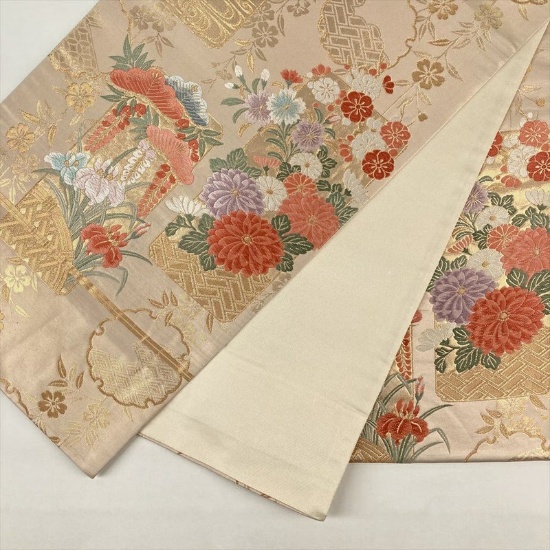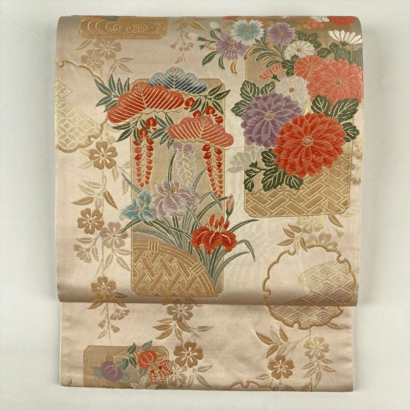 上品で華やかな印象。優美な四季花が咲き誇る、煌めくベージュのフォーマル袋帯。