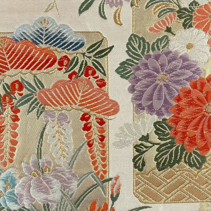柔らかなベージュ地に、雪輪や枝垂れ桜、そして珊瑚色の四季花が咲き乱れる、優美な袋帯です。