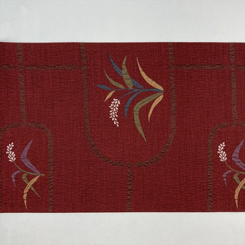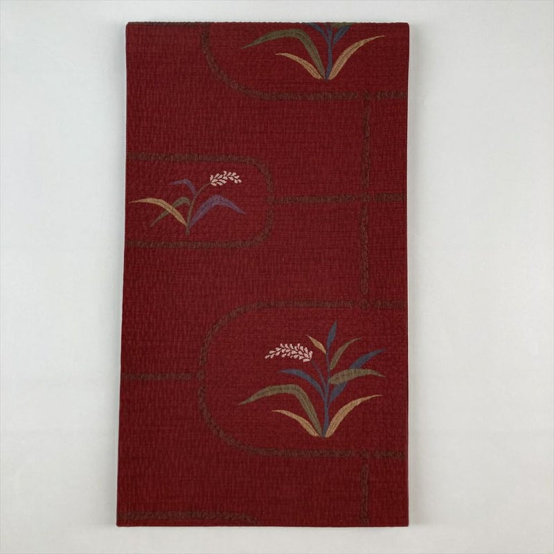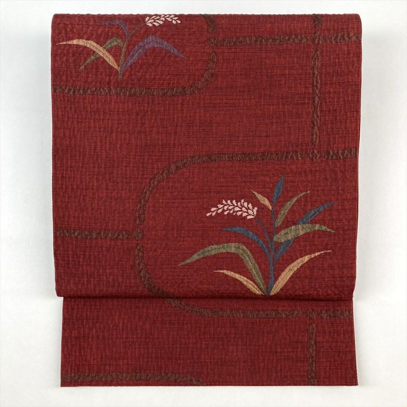 普段使いの着物に合わせるなら、この名古屋帯はいかがでしょうか?深紅の色が、コーディネートに華やかさをプラスします。