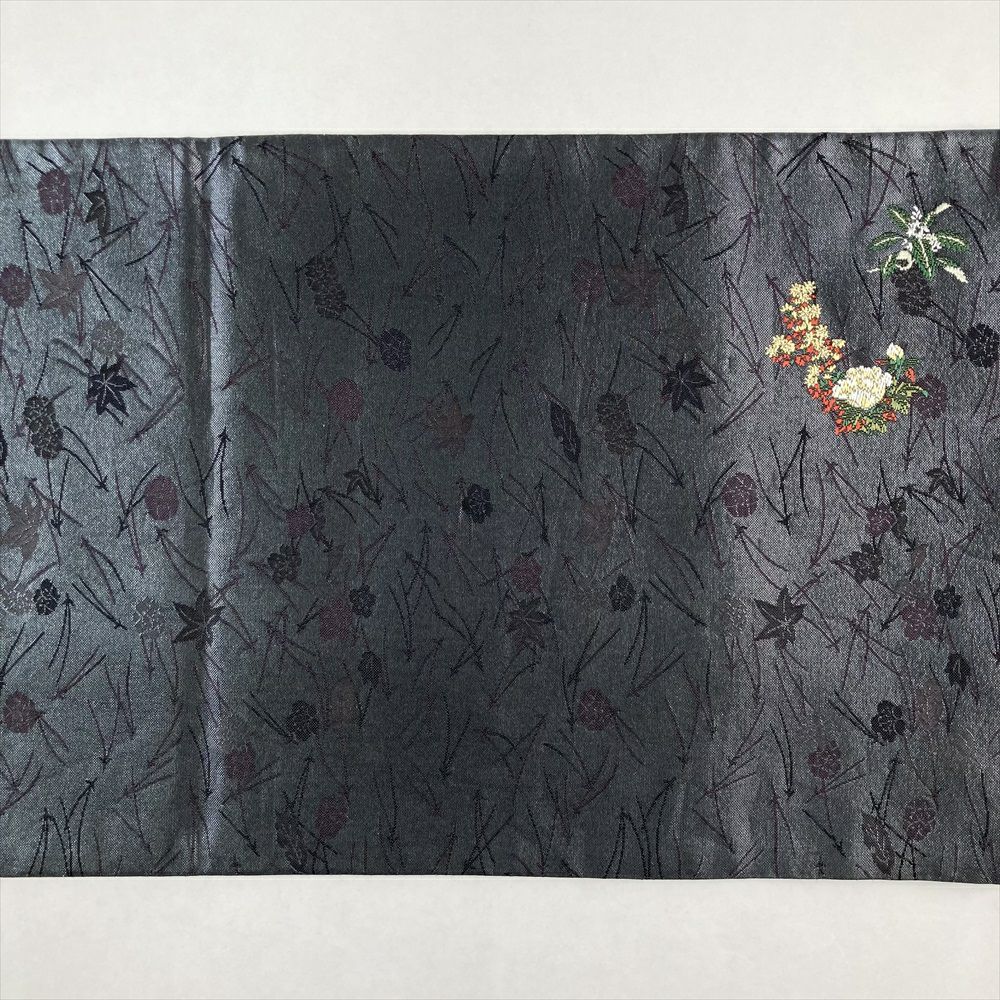 (中古)袋帯 藍墨茶色 セミフォーマル 六通 織り真珠箔 一輪挿し 吹き寄せ 絹