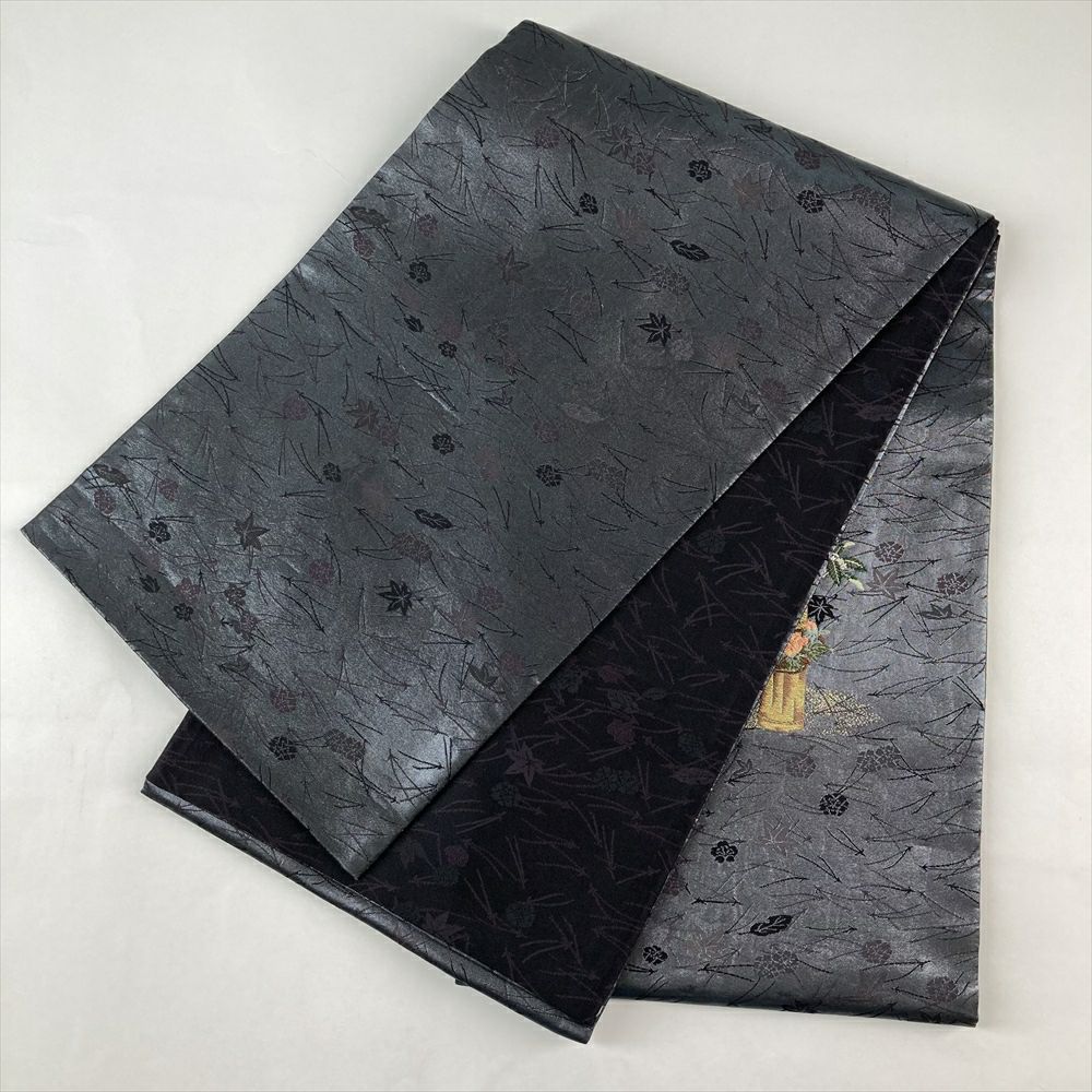 京都西陣、浅山織物謹製。藍墨茶色の地に、真珠箔の煌めきが美しい袋帯です。