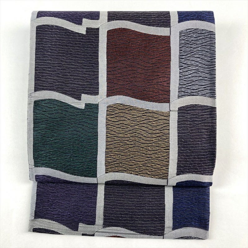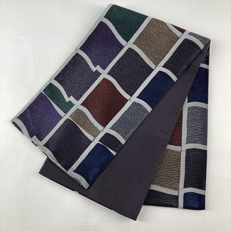 (中古)袋帯 紫色 マルチカラー カジュアル 六通 色糸 瓦 抽象柄 絹
