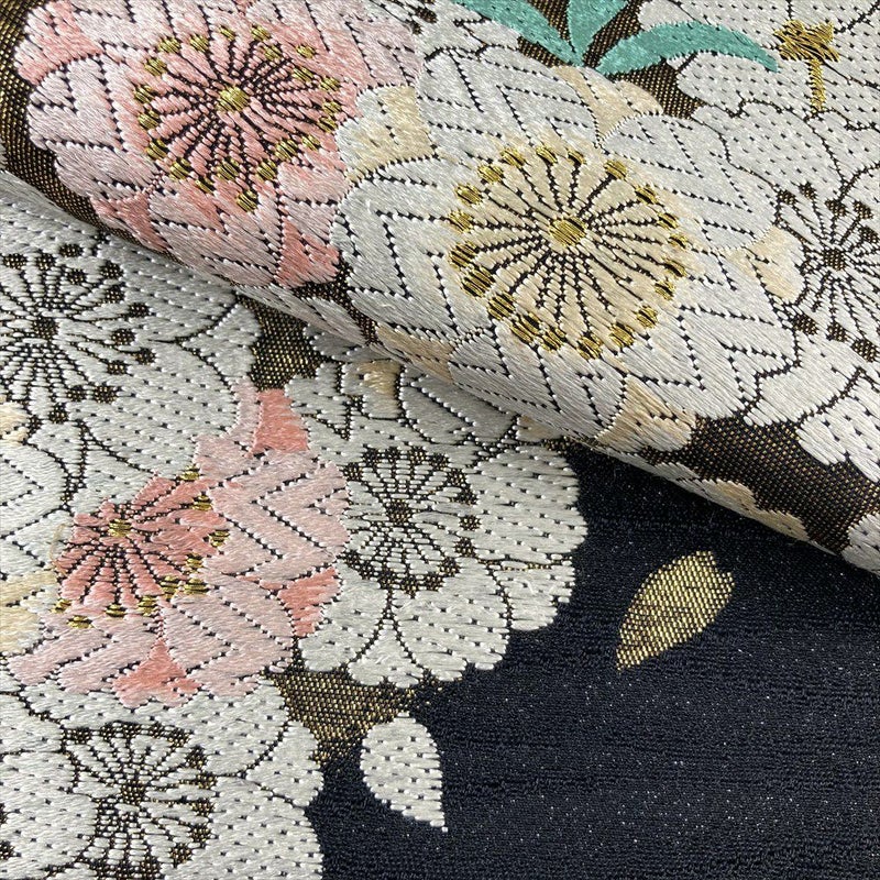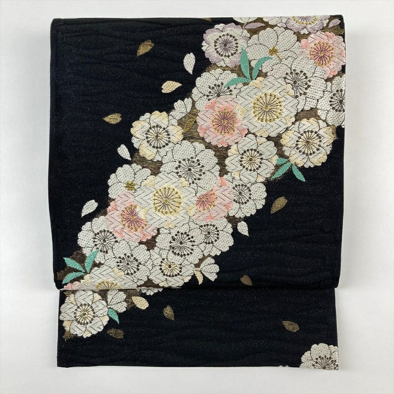 (中古)袋帯 黒 セミフォーマル 六通 金糸 色糸 桜 絹