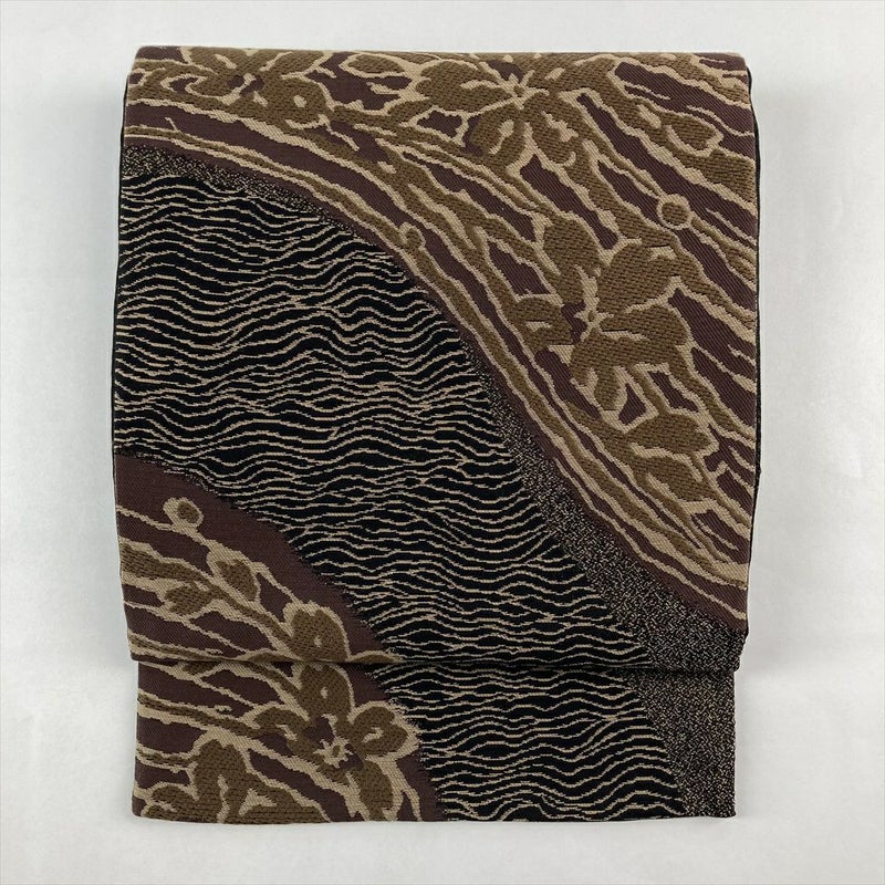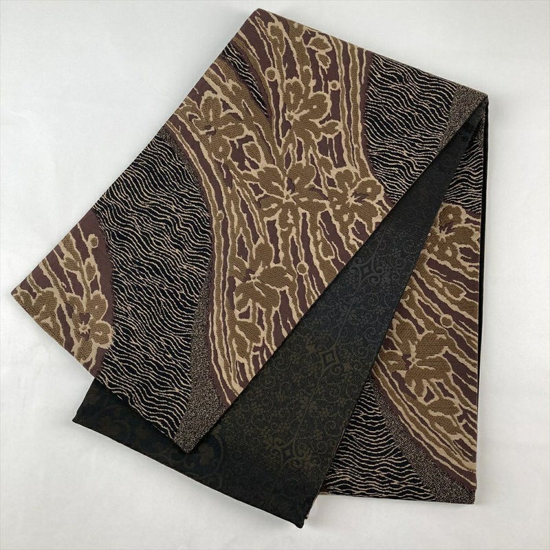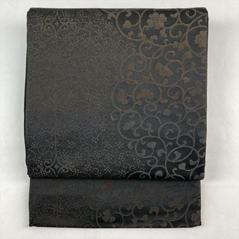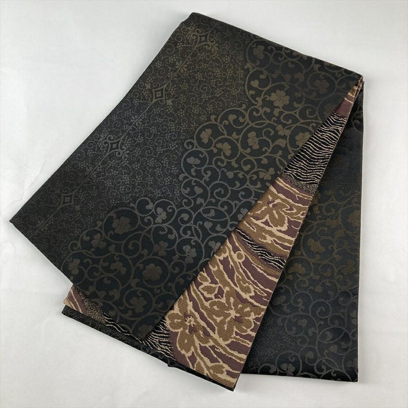 (中古)袋帯 黒色 カジュアル 六通 織り 表:抽象柄 裏:蔓花 絹 リバーシブル