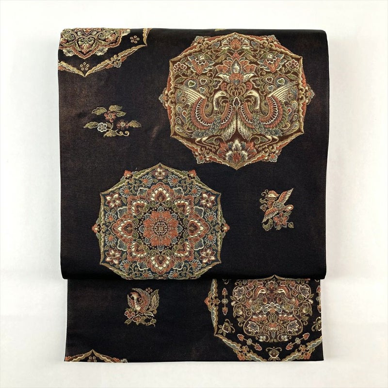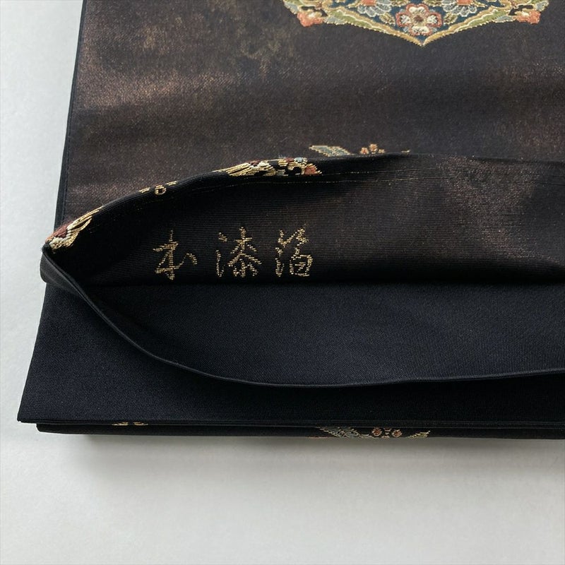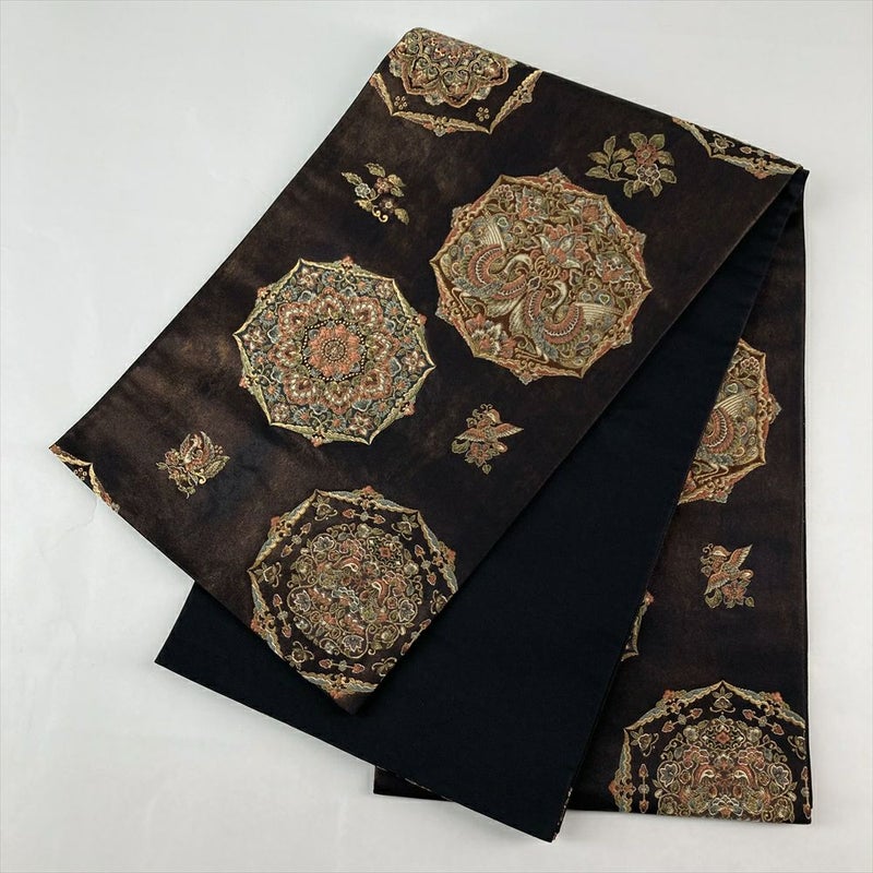 黒茶色の地に、エキゾチックな宝華文が華やかに配された、正絹の袋帯。