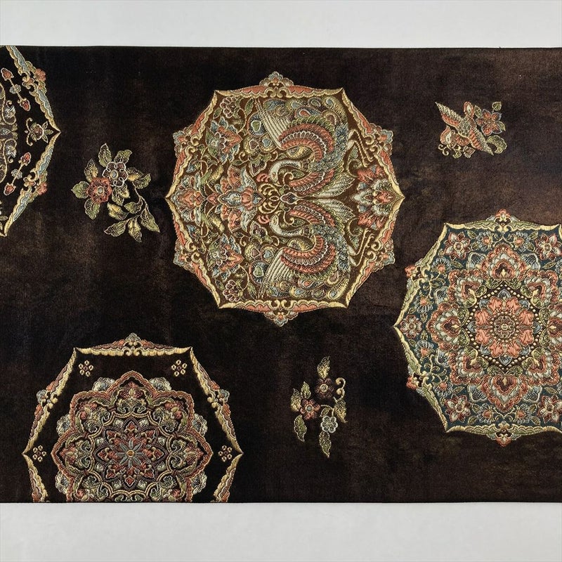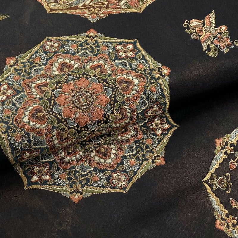 黒茶色の地色が、柄の華やかさを引き締め、上品で落ち着いた印象を与えます。光の角度によって表情を変える、奥深い輝きも魅力です。