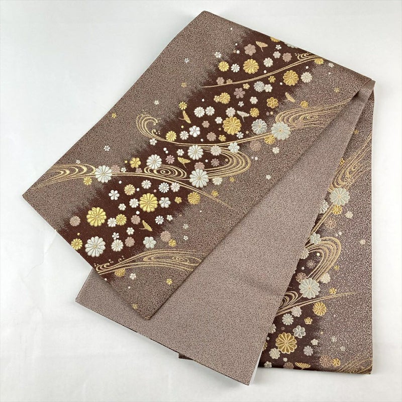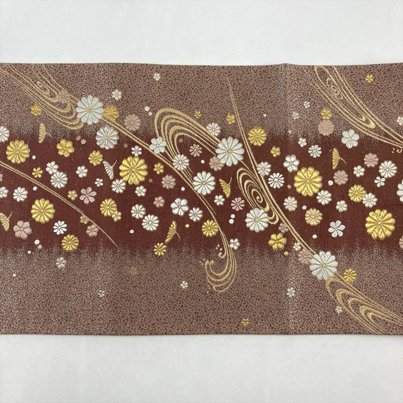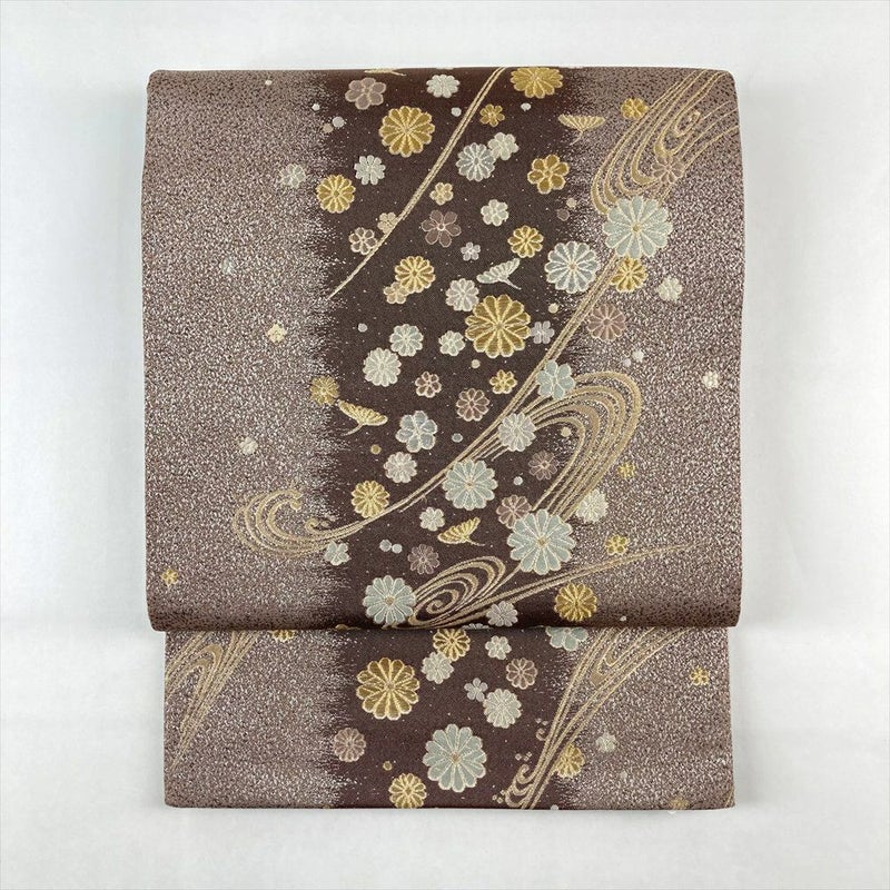 (中古)袋帯 焦げ茶色 セミフォーマル 六通 金糸 流水 菊花 絹