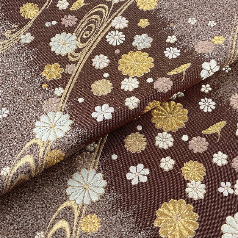 焦げ茶色の地に、金色に輝く菊の花々。その美しさに、思わず息をのむ正絹の袋帯をご紹介いたします。