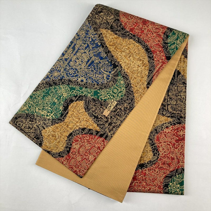 (中古)袋帯 マルチカラー カジュアル 全通 染め 金糸 花鳥 更紗 絹