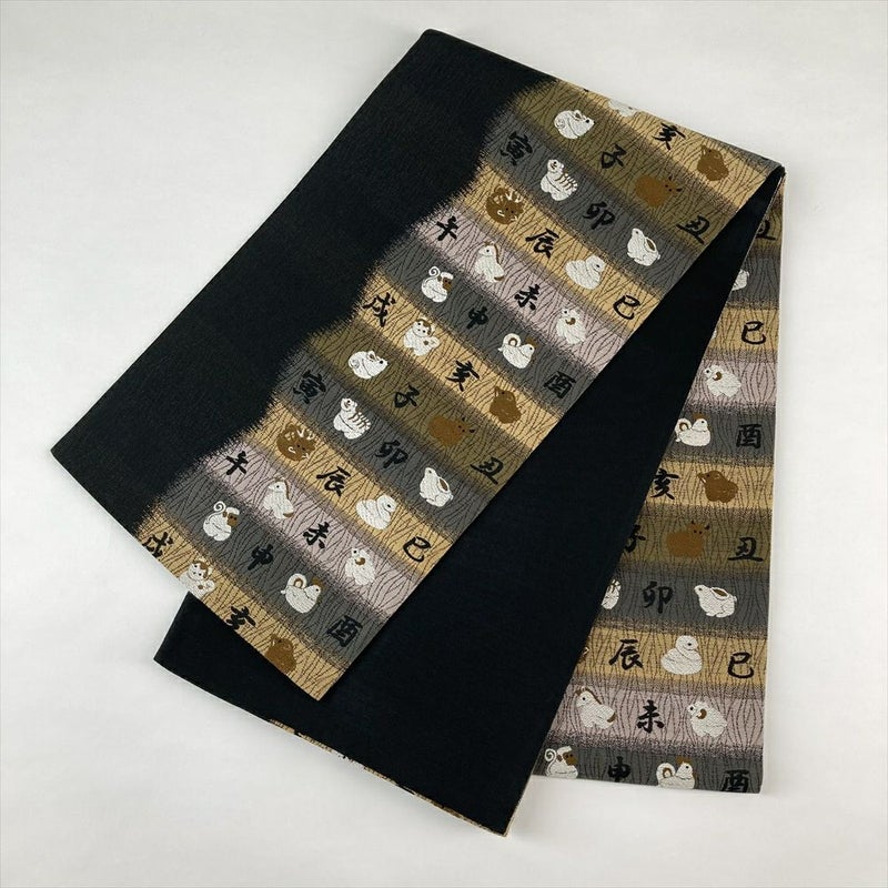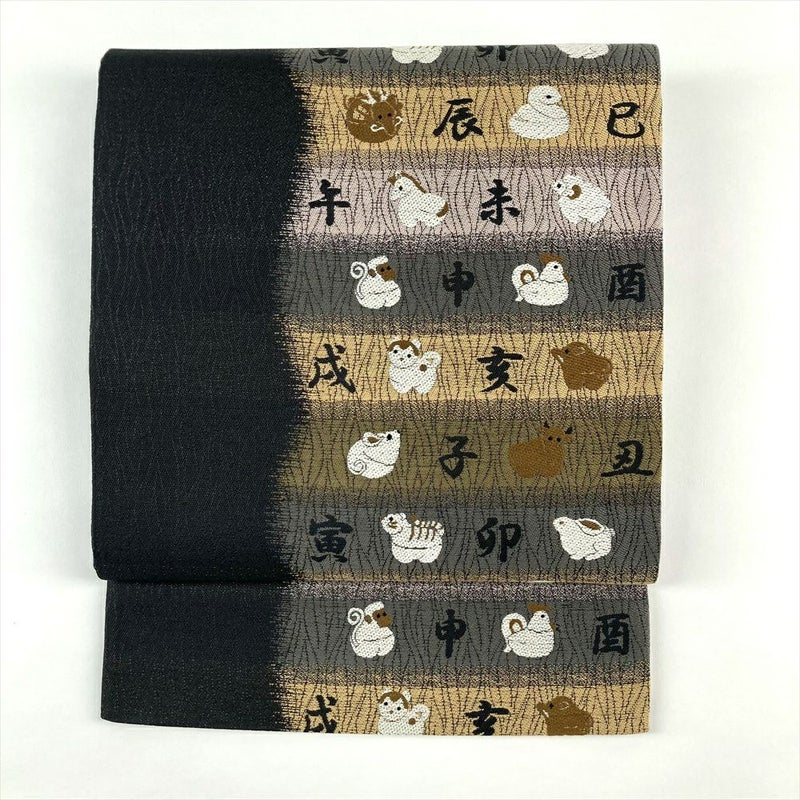 (中古)袋帯 黒 カジュアル 六通 織り 干支 絹