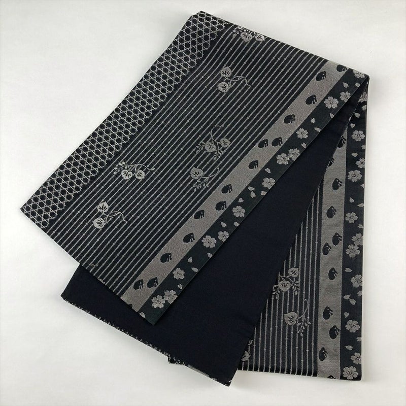 (中古)袋帯 黒 カジュアル 全通 銀糸 籠目 縞 葵 兎 桜 絹