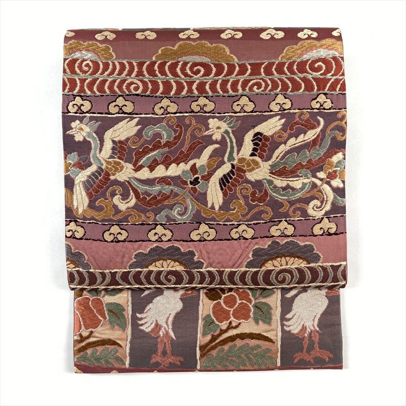 (中古)袋帯 紅梅 ピンク 紫 セミフォーマル 六通 織り 引き箔 鳳凰 瑞雲 絹