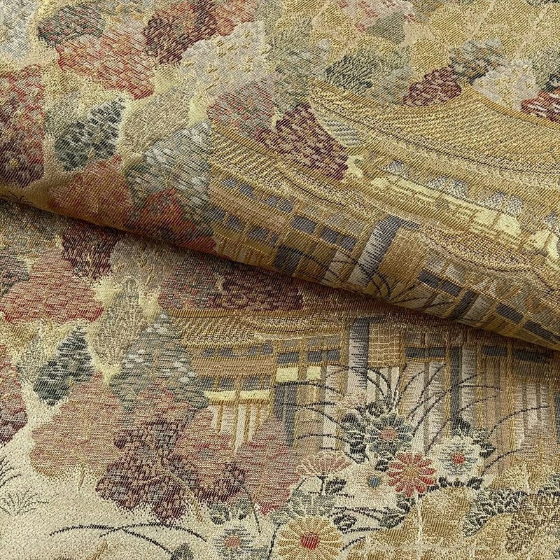 京洛紹巴図は、京都の美しい風景を繊細に織り上げた、格式高い文様です。本金箔の輝きが、京洛の雅やかな情景をより一層引き立て、着物姿に上品な華やかさを添えます。