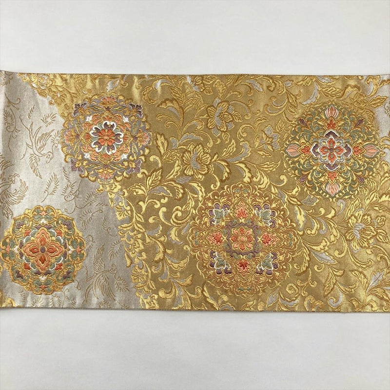 正絹のしなやかな生地に、天上の風を思わせる優雅な宝相華文様が織り込まれた袋帯です。金色を基調とした絢爛豪華なデザインは、フォーマルな装いに格別の華やかさを添えます。