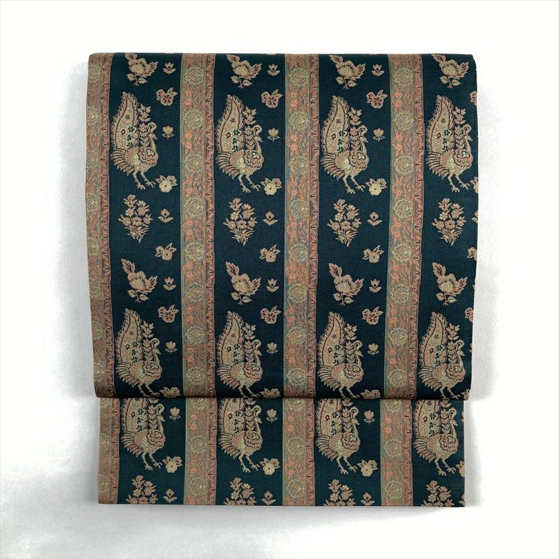 (中古)袋帯 深青緑 カジュアル 全通 色糸 孔雀文 オリエンタル 絹