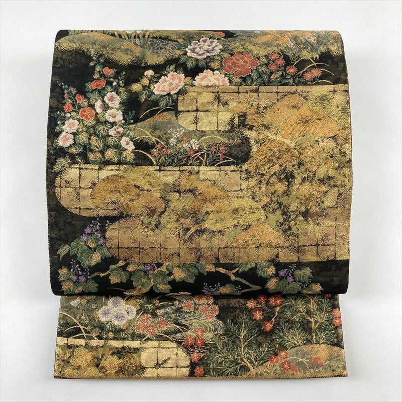 この袋帯は、琳派の美意識が息づく黒地に金で四季花が織りなされた逸品です。