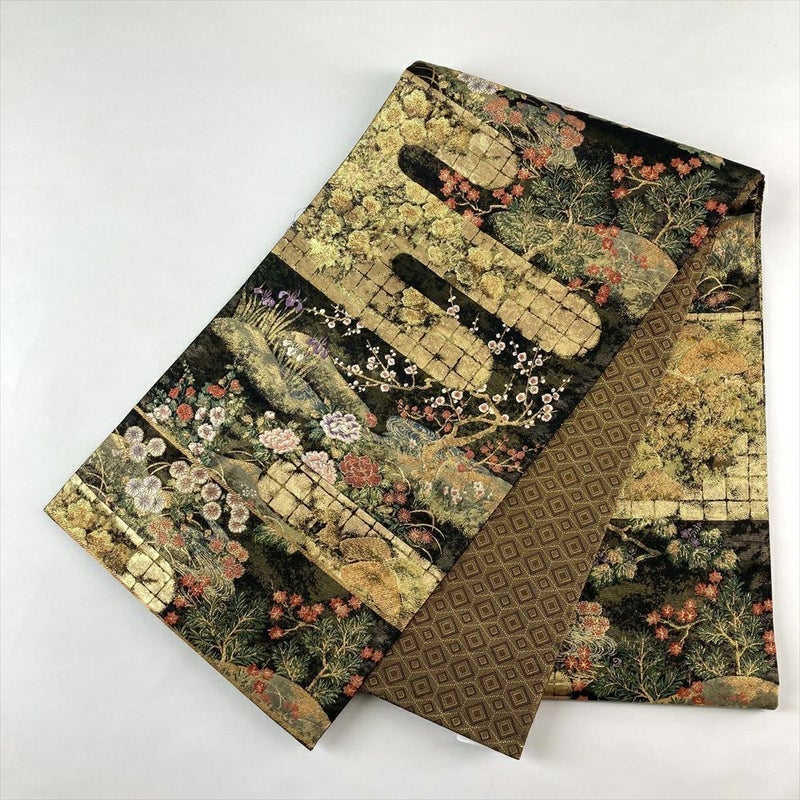 (中古)袋帯 金色 黒色 フォーマル 六通 引き箔 金糸 色糸 琳派 四季花図 絹