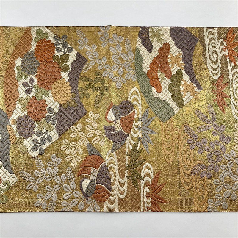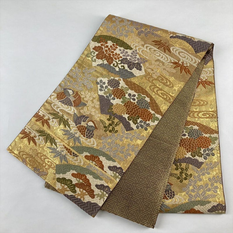(中古)袋帯 金色 フォーマル 六通 引き箔 色糸 唐織 扇面 花鳥 絹