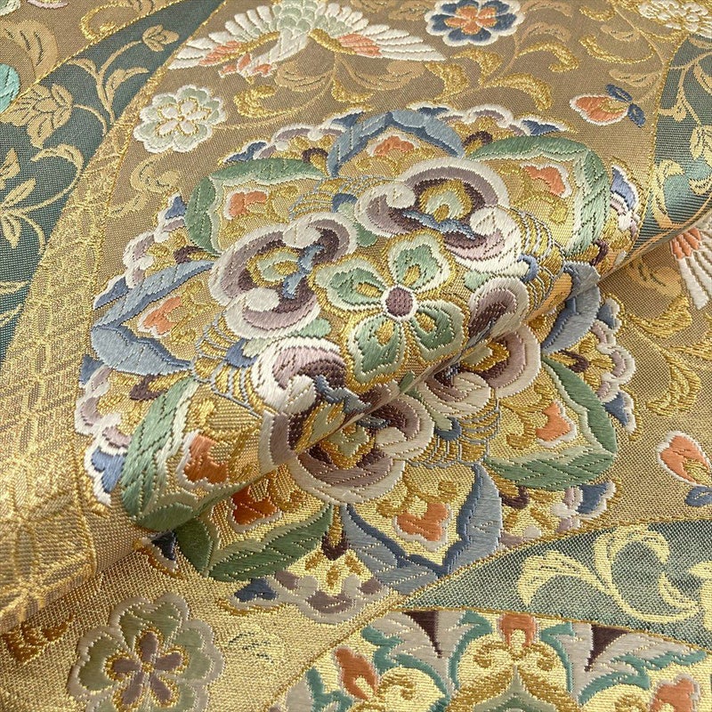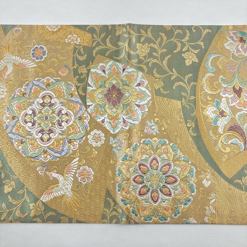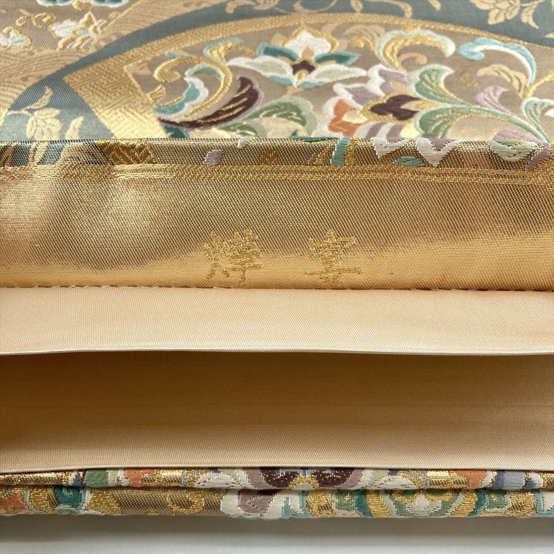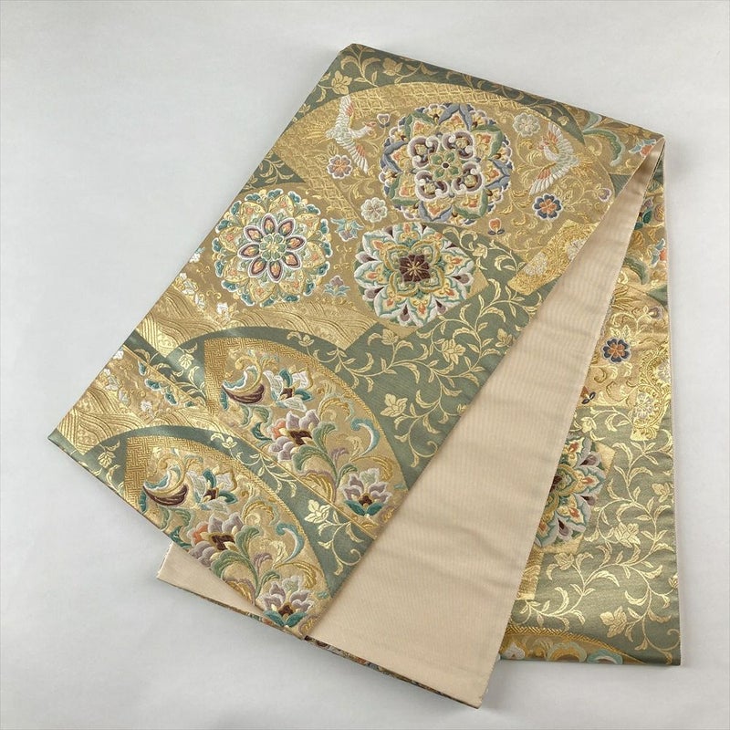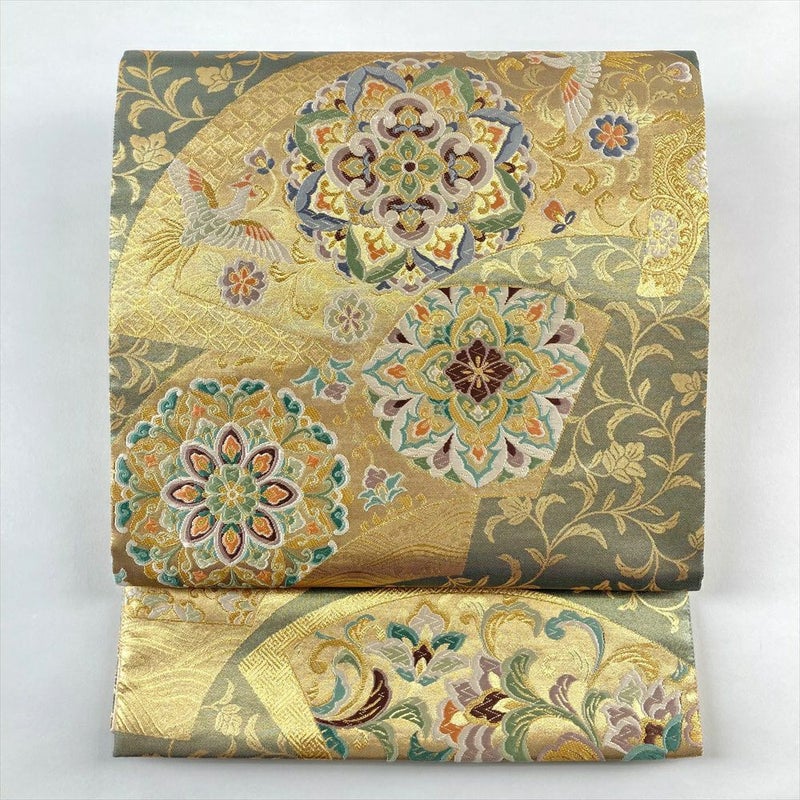 (中古)袋帯 金色 灰緑 フォーマル 六通 引き箔 金糸 いろ 扇面 華文 花唐草 絹