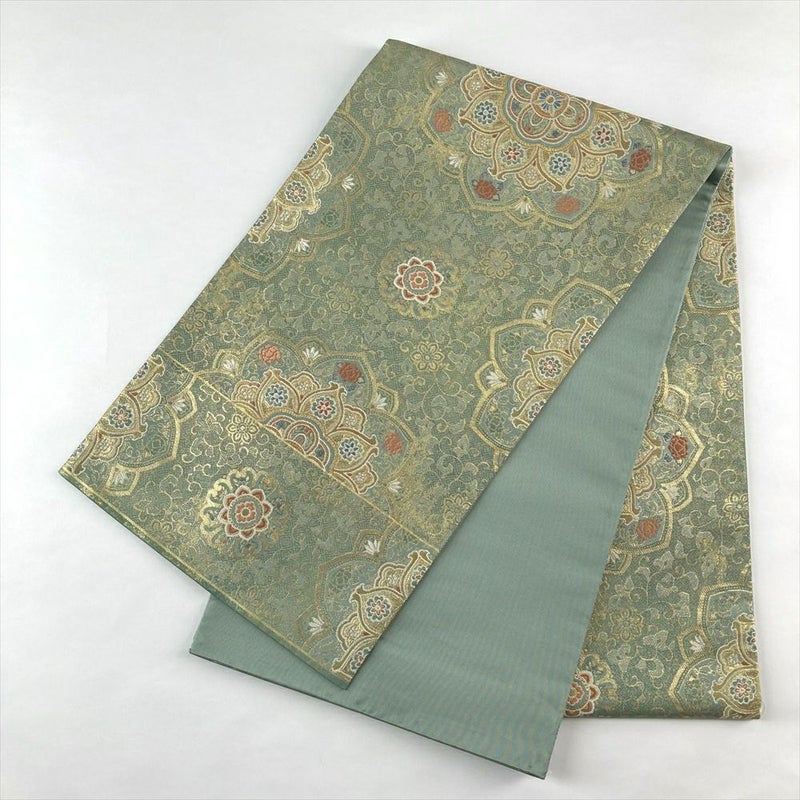 (中古)袋帯 金色 灰緑 フォーマル 六通 引き箔 金糸 色糸 唐草華文 絹