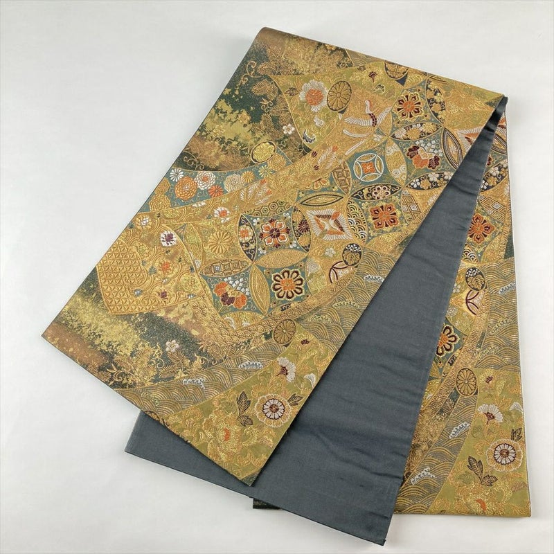 (中古)袋帯 金色 フォーマル 六通 引き箔 金糸 色糸 巻物 七宝 花鳥 絹