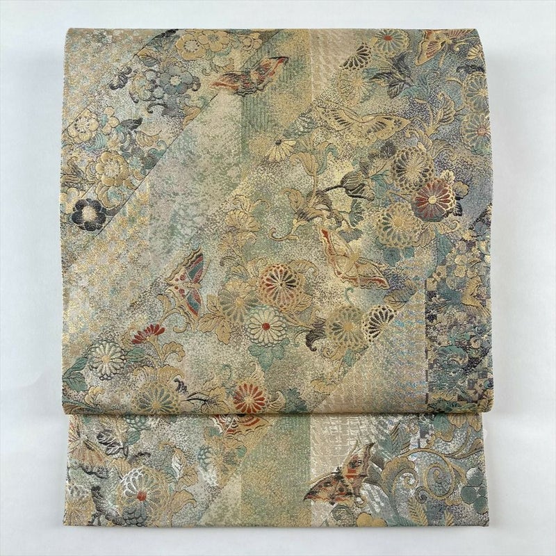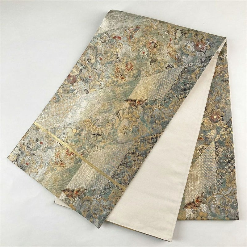 (中古)袋帯 金 銀 セミフォーマル 六通 引き箔 花蝶 絹