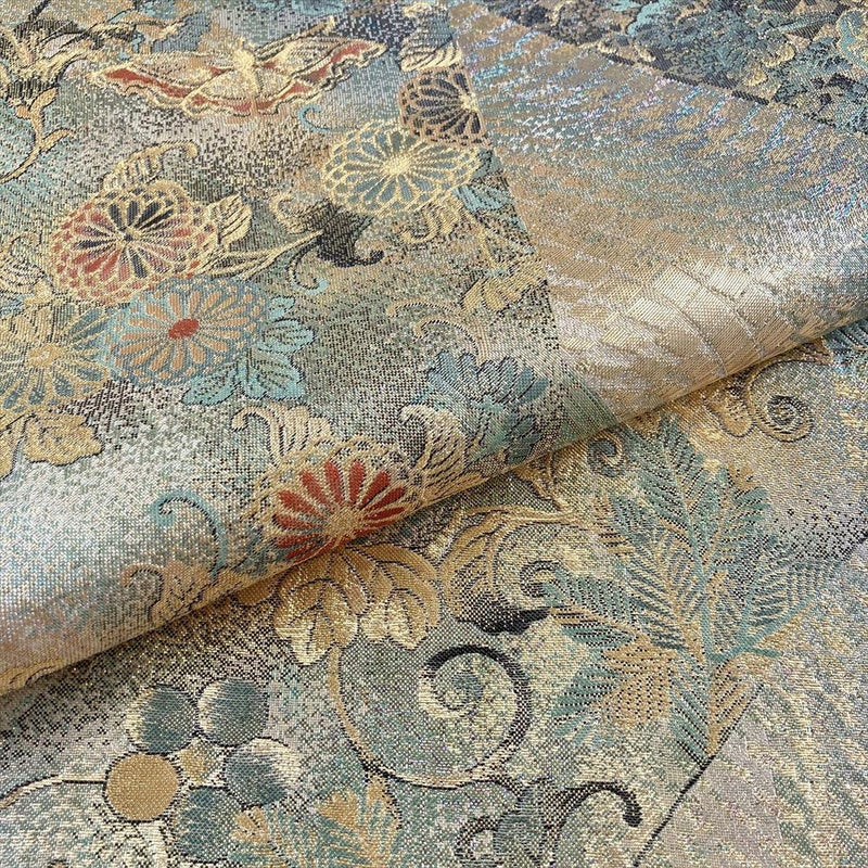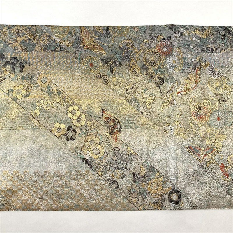 金糸で織りなされた花蝶が優雅に舞う袋帯です。上質な絹の光沢が、動くたびに豊かな表情を見せ、見る人を魅了します。