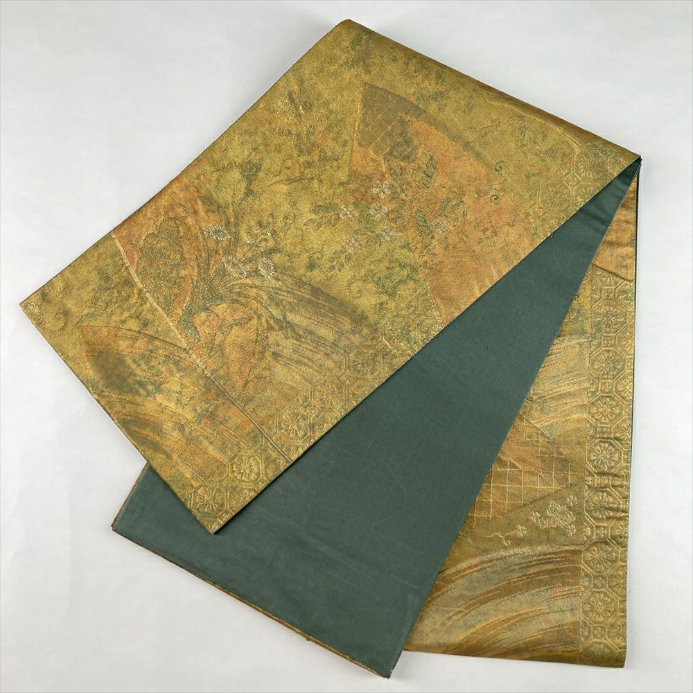 落ち着いた金緑に、ふっくらとしたふくれ織りの質感が美しい袋帯。