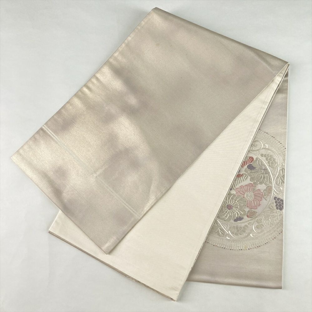 (中古)袋帯 薄金銀 セミフォーマル 六通 織り 刺繍 花絵皿 絹