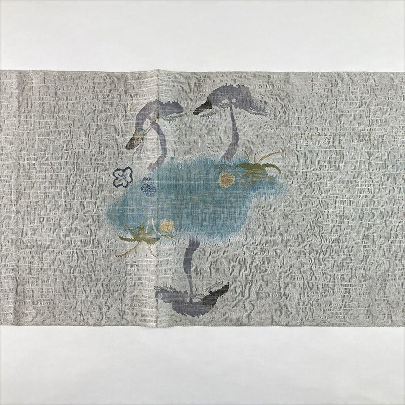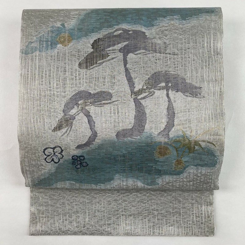 クールな銀鼠色の地に、水辺の風景を抽象的に表現した文様が織り上げられています。