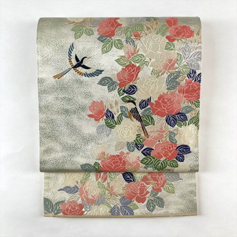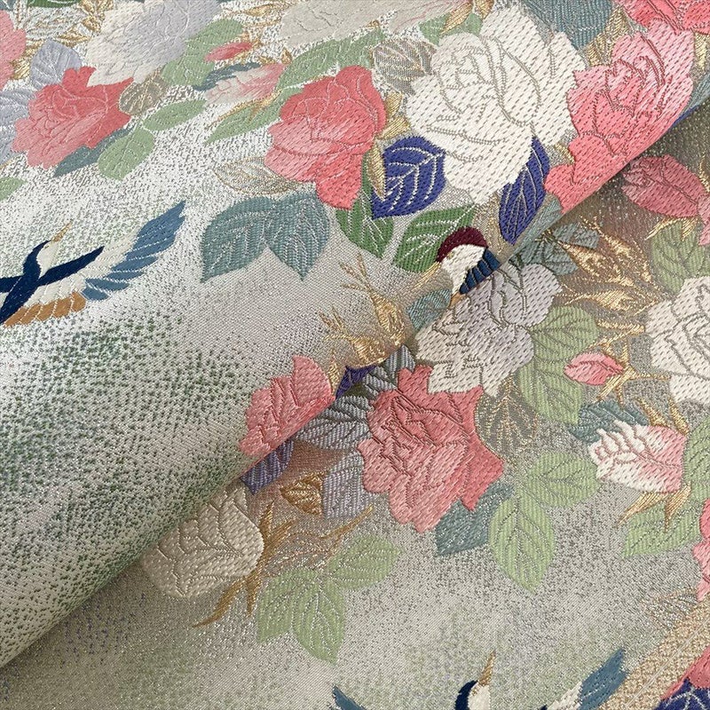上品な光沢を放つ帯地には、優雅に咲き誇る薔薇と、その周りをさえずる可愛らしい小鳥たちが繊細に織り描かれています。