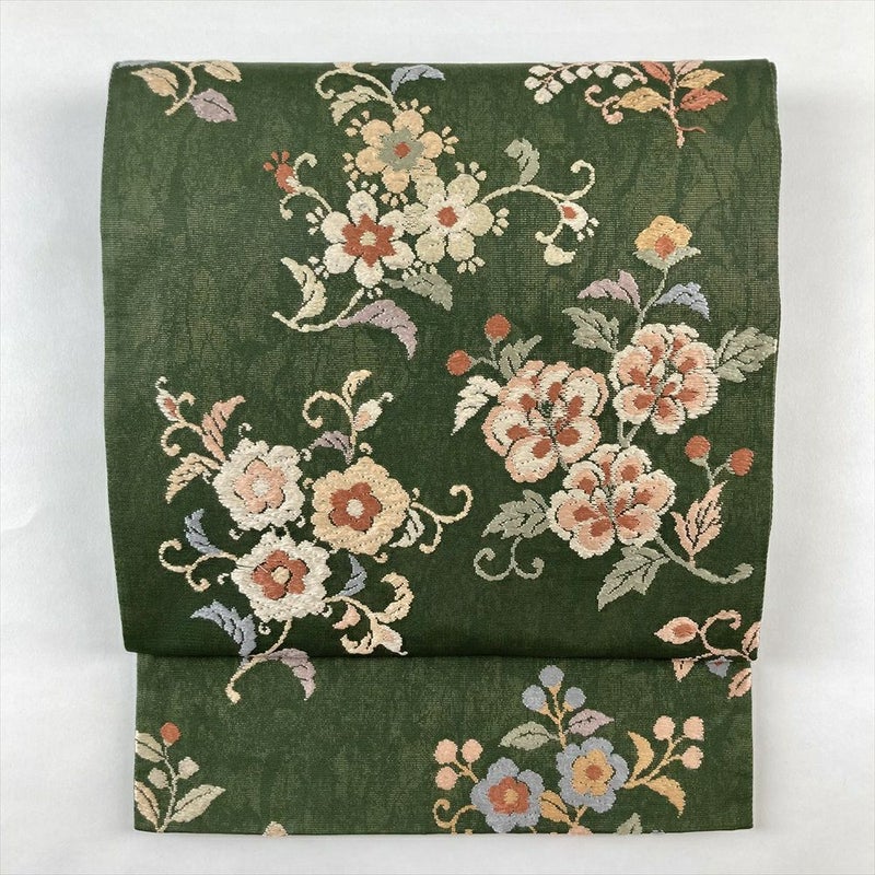 (中古)袋帯 緑 セミフォーマル 六通 織り 色糸 金糸 天平文 絹